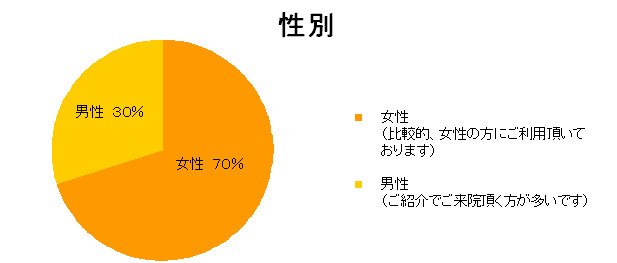 当院には、様々な患者様がお越しくださいます。 「男女比は?」 「どんな症状の方が多いの?」など、 初めてお越し下さる方にとっては、様々な疑問があるかと思います。 そこで、ご来院頂きました患者様を性別・症状別・年代別に、円グラフにまとめてみました。 ご来院の際の参考にして頂ければと思います。