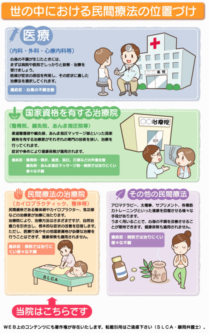 世の中における民間療法の位置づけをイラストで紹介いたします。